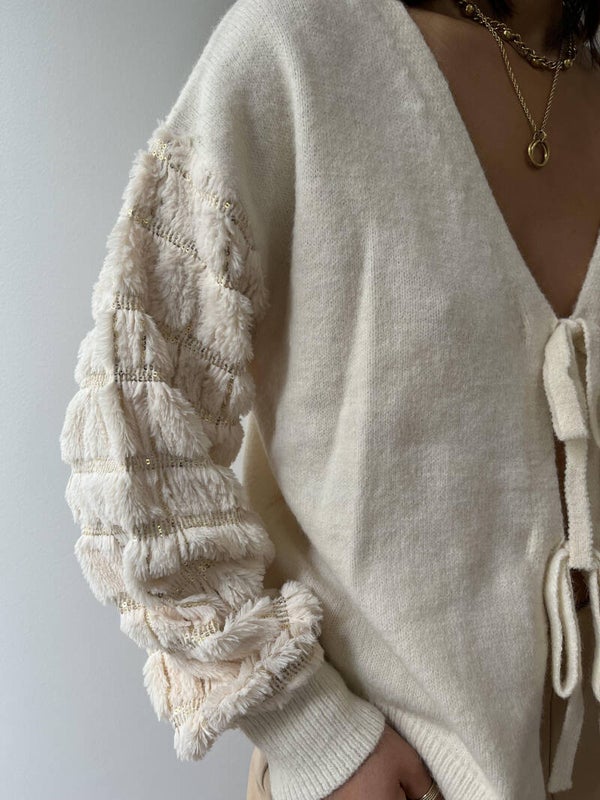 Découvrez notre pull sophistiqué orné d'un nœud au dos, avec des manches en peluche et des détails dorés, confectionné en polyamide, polyester et acrylique. Ce pull combine élégance, confort et une touche de luxe moderne grâce à ses détails raffinés et ses matériaux de haute qualité. Il peut être porté dans les deux sens.