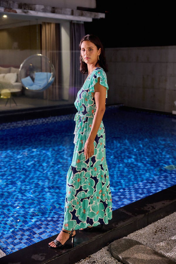 Robe longue imprimée avec encolure dégagée et manches courtes. Confectionnée dans un tissu très léger, elle est parfaite pour la saison.